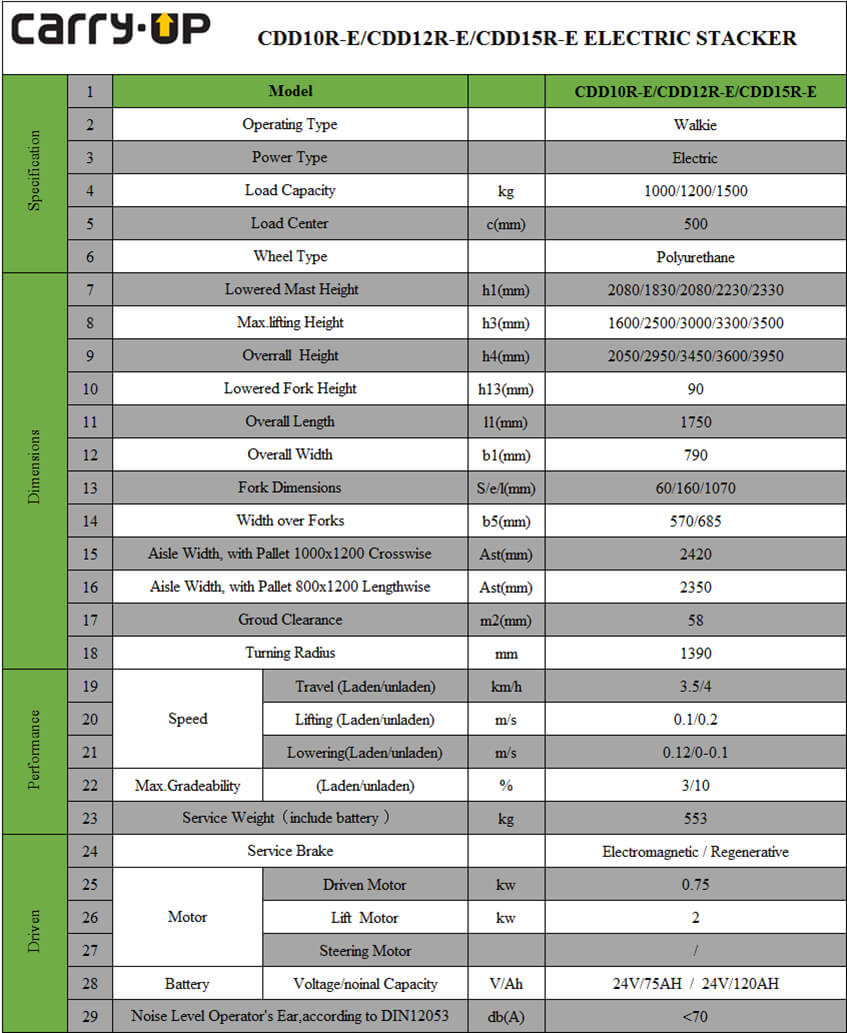 8. A narrow classis design, small battery compartment and tiller arm steering with 180° range give this compact stacker excellent maneuverability even in limited space.