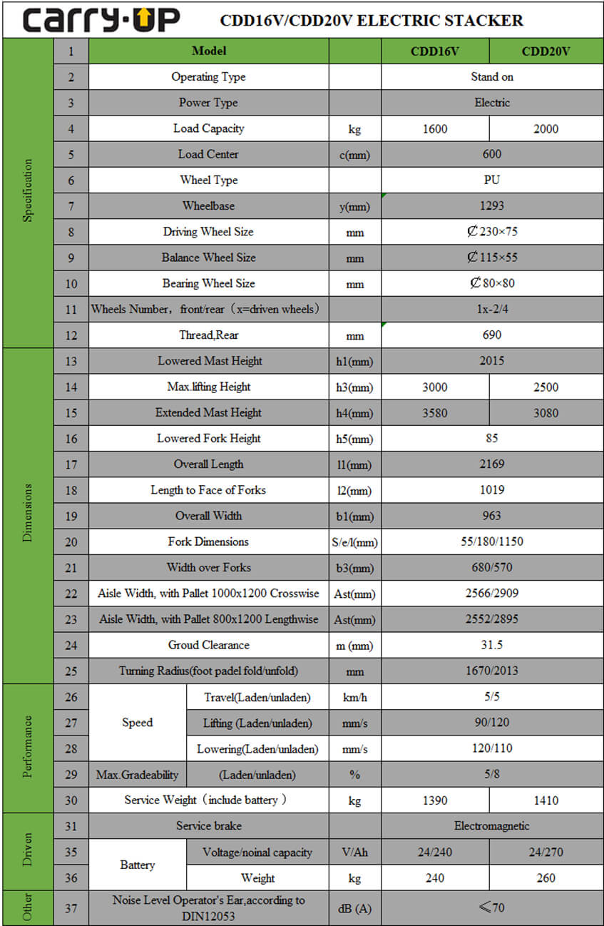 8. A narrow classis design, small battery compartment and tiller arm steering with 180° range give this compact stacker excellent maneuverability even in limited space.